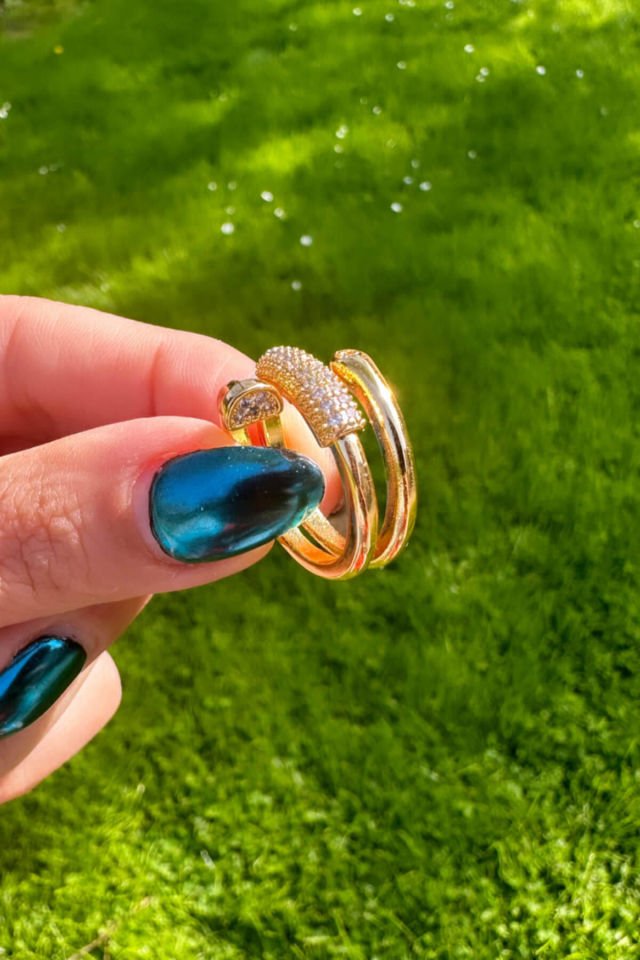 Gold Renk Üç Sıralı Taş Detaylı Çivi Yüzük