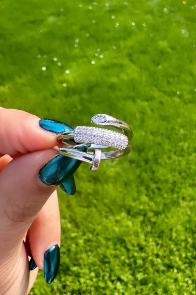 Gümüş Renk Üç Sıralı Taş Detaylı Çivi Yüzük